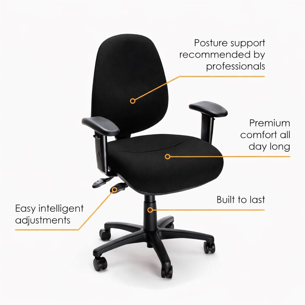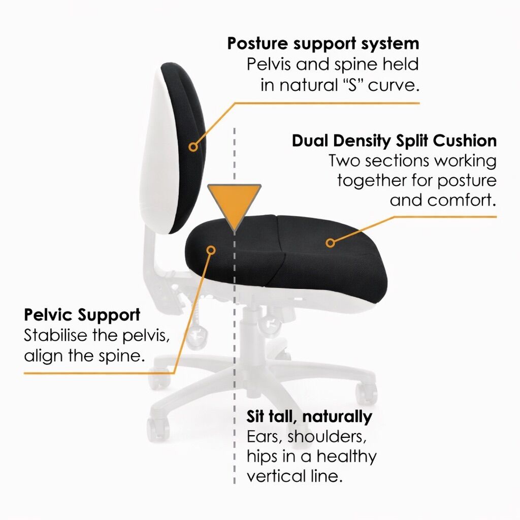 A fully adjustable ergonomic office chair featuring the renowned Dual Density Posture Support Seat - a split-cushion design engineered to encourage pelvic support and sitting comfort.